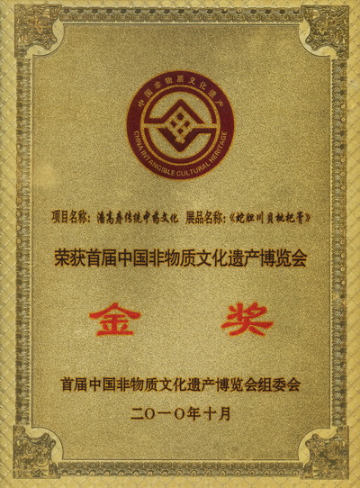 潘高壽傳統中藥文化,作為國家級非物質文化遺產項目,代表廣東參加了首屆中國非物質文化遺產博覽會。本屆博覽會是我國首次舉辦的非物質文化遺產綜合性展會,是全國非遺領域的一件盛事,是一屆圓滿成功、主題鮮明、內容精彩、探索創新的博覽會。博覽會的“展品獎”分金獎、銀獎和銅獎。潘高壽“蛇膽川貝枇杷膏”、北京雕漆技藝“剔紅聽濤圖”中堂掛屏等37件作品榮獲金獎,山東魯繡發絲繡“鵲華秋色”、新疆維吾爾族樂器制作技藝“卡龍”等84件作品榮獲銀獎,西藏藏香制作技藝“直貢藏香”等69件作品榮獲銅獎。